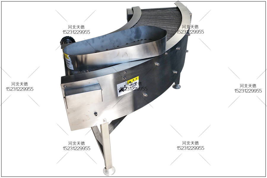 輸送形式為鏈條式金屬網帶,結構形式為轉彎形式,轉彎角度為100度左右,機身采用2.5不銹鋼折彎加工,輸送機腿能夠進行上下30公分的調節,輸送機寬度400毫米,鏈條金屬網帶寬度為350毫米,采用1.2毫米的不銹鋼絲壓彎串接而成的,使用的是U型轉彎鏈條,采用6毫米的支桿鏈接。這種結構形式的金屬網帶耐用性很高。是輸送行業與食品行業中不錯的選擇。